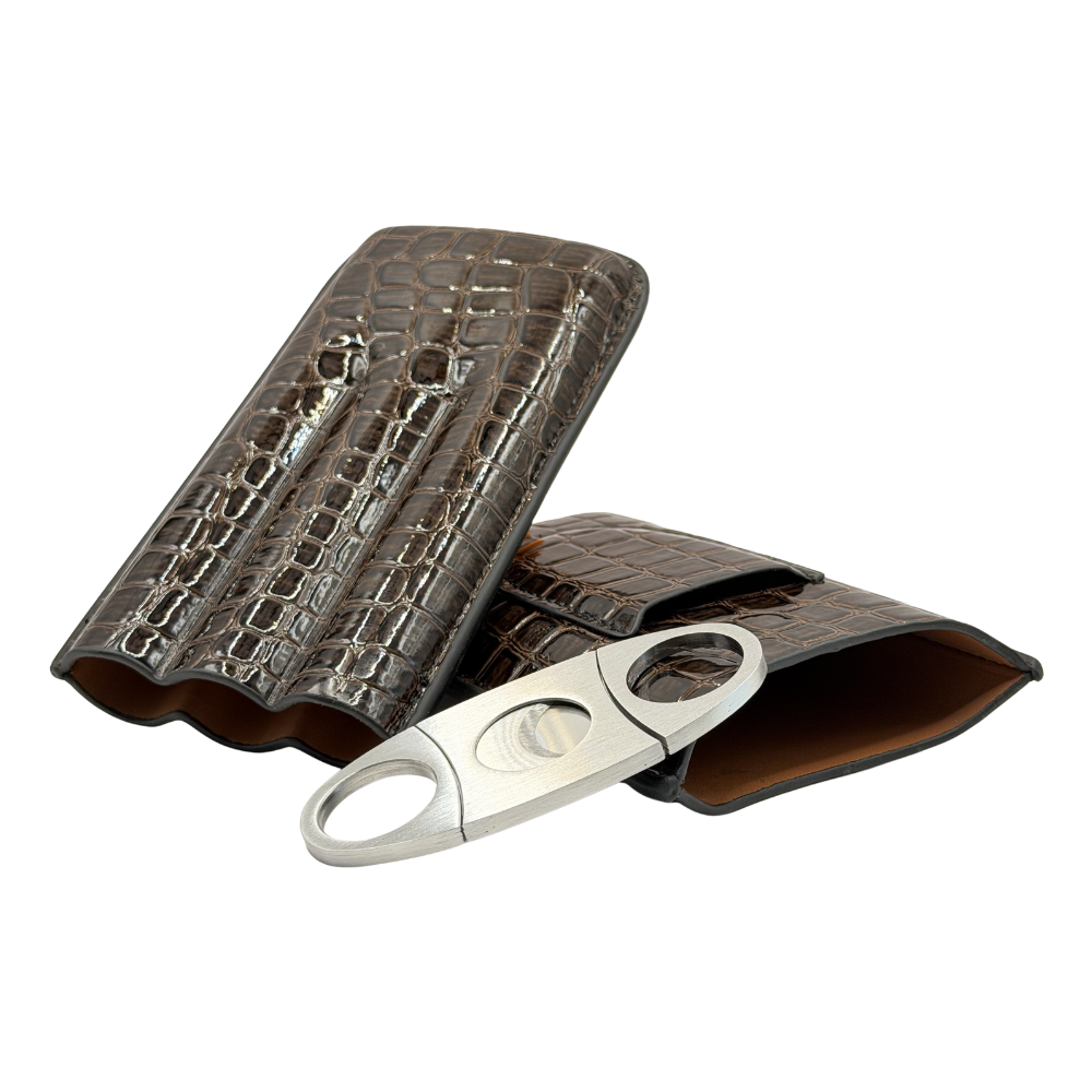 Produzida em couro PU de alta qualidade, possui acabamento sofisticado com padrão clássico, garantindo durabilidade e um visual refinado. Conta com capacidade para até 3 charutos, mantendo-os organizados e protegidos durante o transporte.