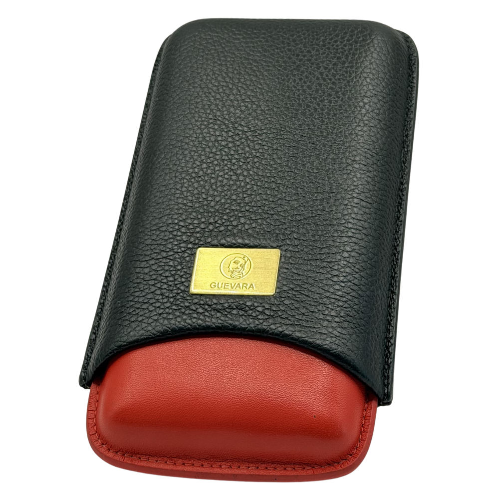 Produzido em couro, apresenta acabamento sofisticado com textura externa preta e interior em tom vermelho, oferecendo um visual clássico e refinado. Possui capacidade para até 3 charutos, com compartimento interno moldado que mantém os itens organizados e protegidos durante o transporte.